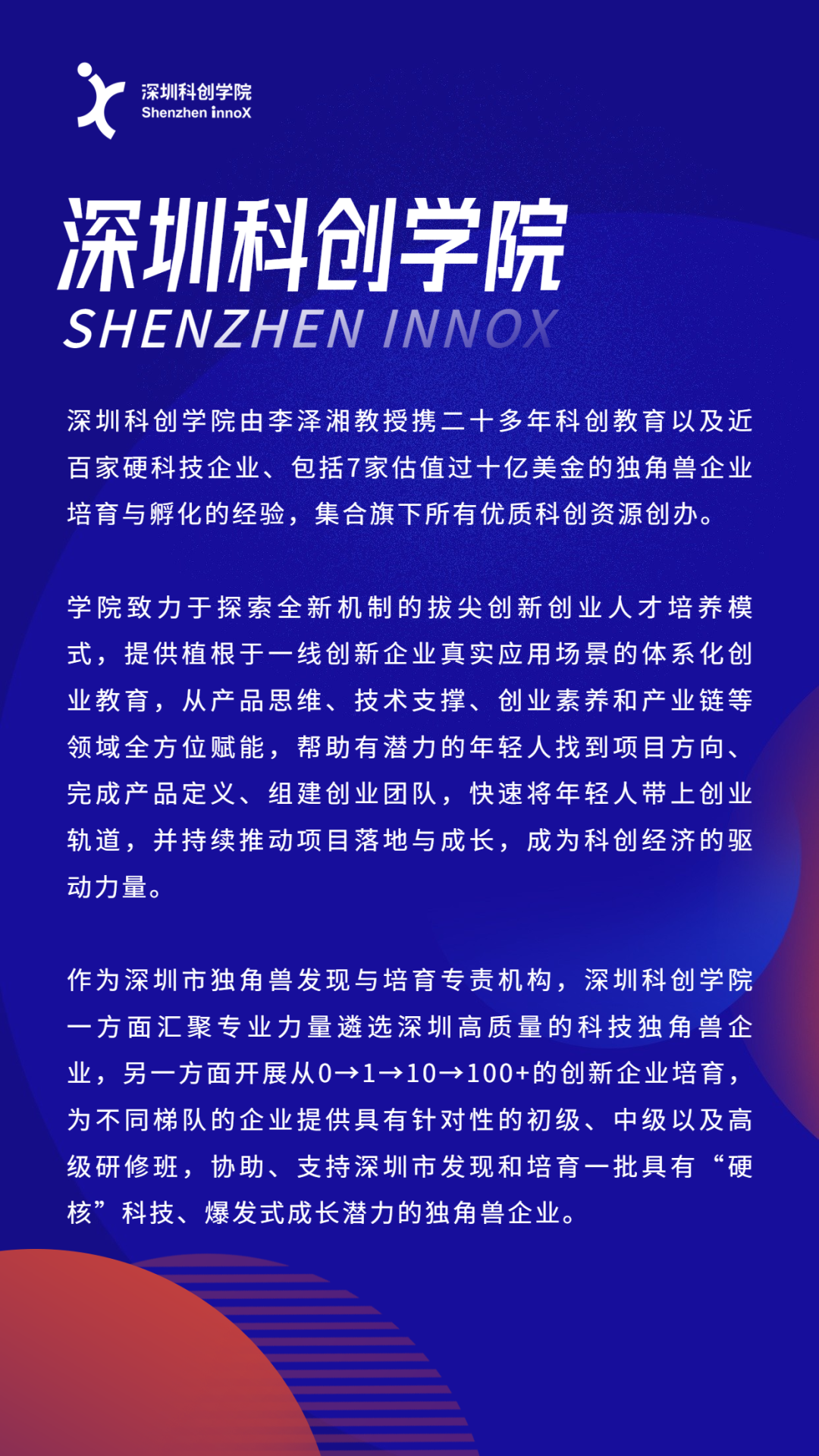 如今,深圳科创学院落地南山,意味着“双区联动”全新发展模式的开启。坪山是一座蓬勃发展中的创新之城、梦想之城,始终坚持创新是第一动力,打造全域全链创新生态体系;南山则集结着丰厚的战略性新兴产业资源及西丽湖国际科教城产学研生态,是一片魅力无限的创新创业沃土。未来,“南山-坪山”将发挥各自优势,相互驱动、深度融合,赋能更多创业者们向着科技创新创业前进,将迸发出全新的“科创力量”!深圳科创学院致力于探索全新机制的拔尖创新创业人才培养模式,提供植根于一线创新企业真实应用场景的体系化创业教育,从产品思维、技术支撑、创业素养和产业链等领域全方位赋能,帮助有潜力的年轻人找到项目方向、完成产品定义、组建创业团队,快速将年轻人带上创业轨道,并持续推动项目落地与成长,成为科创经济的驱动力量。科创学院通过举办科创训练营,从中选拔学员参与创业学习实践;构建大学联盟,与联盟高校联合培养学员,使学员的本校学位与学院证书可以兼得;创建企业联盟,给予学员调研产业真实场景的机会,自己去发现问题和定义问题。学院设置项目中心,深入探索智能驾驶、智慧健康、智能建造、智慧生活等领域,以及七大支撑实验室:结构设计与原型实验室、电子实验室、电机实验室、可靠性实验室、数据与AI实验室、仿真实验室、传感器实验室,提供前沿技术支撑,链接优质产业资源,汇聚顶级学界和产业专家以及李泽湘教授科创体系的创业师兄师姐资源,手把手地指导学员进行创业探索,全力打造人才培养-项目孵化-科技创业的创新生态系统。同时,作为深圳市科技独角兽发现与培育专责机构,深圳科创学院一方面汇聚专业力量遴选深圳高质量的科技独角兽企业,另一方面开展从0→1→10→100+的创新企业培育,为不同梯队的企业提供具有针对性的初级、中级以及高级研修班,协助、支持深圳市发现和培育一批具有“硬核”科技、爆发式成长潜力的独角兽企业。