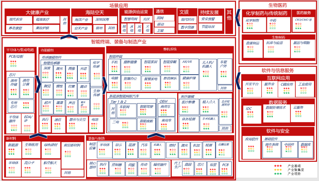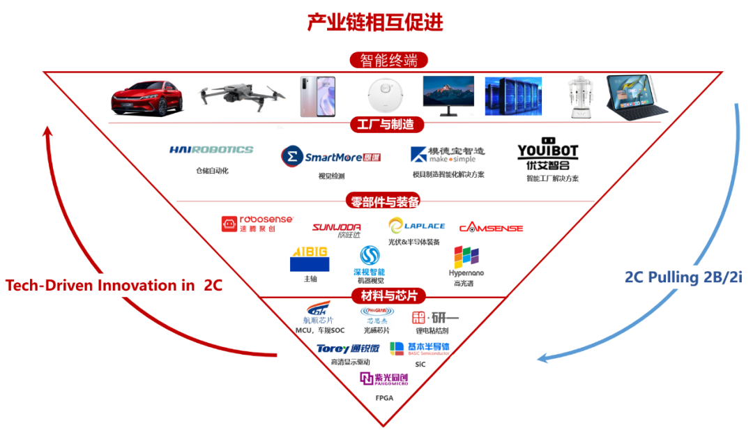 底层的核心零部件,包括材料、芯片、装备,以及工厂与智能制造,都是支撑终端产品的护城河与保障体系,即“技术驱动”。而顶层的终端产品又能带动下层领域的发展,我们把这种带动力量称为“市场驱动”。技术驱动和市场驱动相辅相成,构成深圳产业的两大关键闭环。