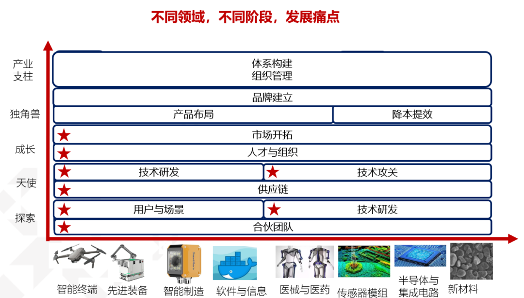 企业的发展存在几个不同的阶段——探索阶段、天使阶段、成长阶段、独角兽再到行业的支柱,只有将各个阶段的特点、企业的需求、痛点梳理清楚,在制定政策、对接资源时才能更有的放矢。